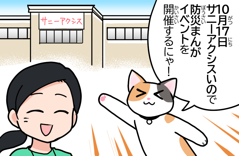など、楽しいコーナーを準備してお待ちしております。ご参加頂いた方には、もれなく防災ねこの「キキ」ステッカーをプレゼント!